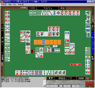 ■1回戦目 しかし、接続のトラブルによって一夜漬け的なメッキははがれ落ち、飯田プロは心の底でパニックしたまま、スタートするハメに陥ったのでした。 好スタートを切ったのは、わんわん氏とMr.珍Jr.氏でした。その一方で、飯田プロは「まず一回アガらなきゃ」と、心の落ち着きを取り戻そうとしている状態が続いていました。マウスを使うことに、宇宙服を着て歩いているような感触を持っていたのでしょう。とくに致命的だったのは南1局で、チーしようとした牌を鳴けずに、切るつもりのない牌で振り込んでしまったのです。 そもそも、ミスなどなくとも、いらない牌をツモ切りしただけで、振り込んでしまうような局が続いていました。 そこで迎えたのが南2局0本場です。南場の親番、それは沈んでいる者にとって一筋の希望と言えるでしょう。挽回する可能性はこの局にかかっている。そんな気持ちで臨むものです。 ここで飯田プロに早いテンパイが入ります。6巡目に即リーチ。これがその捨牌です。 この捨牌、じつは「捨牌読み」に役立つモデルケースとなっています。これがそのときの手牌で、待ちはカン なぜこの手牌が捨牌読みに役立つのでしょう。それは早いチュンチャン牌(2〜8の牌)切りは、そのスジ牌をまたぐスジが危ないという典型例になっているからです。具体的には、 というのは、手牌に 早く切られたチュンチャン牌の裏スジと裏々スジは本命のひとつとなる。それが捨牌読みのセオリーと言えるのです。厳密に言うならば、そこが待ちになっているかどうかは分かりませんが、4メンツのひとつがそこにあるわけです。 4巡目、飯田プロの手牌はこうなっていました。