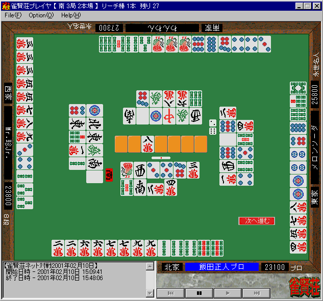 こんな678の三色がはっきり見えている手牌から、あっさりと このとき、手牌はピンフが確定しており、ドラの この選択はみごとに的中し、このあと飯田プロは これが頂点に立つプロの底力なのか? それとも、麻雀プロはそもそもツイているのか? それとも飯田プロはやはり豪腕なのか? 1回戦、とりあえず飯田プロはあまりにも幸運な勝利を治めたのでした。 |