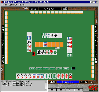 ■1回戦目 東1局3巡目、村上プロの手牌はこんな具合になりました。 ドラ ここで村上プロの打牌は。 このとき、ドラの切りはまだ早いとすれば、という三つのカンチャンから、どれかひとつを外すことになります。そこで村上プロはを選んだというわけです。これは気分で決めているのではなく、同じ手牌が100回来たら、100回ともを切ることでしょう。それは、こういったメカニックな理由によるのです。 まずは、リャンメンに変わる牌が、と2種類あるため、もっとも有望です。そこでとの比較になりますが、とではの方が他人の手牌からあふれやすいため、こちらを狙った方がアガりやすくなるのです。 3と7の牌はキー牌と言われ、その外側である1289への出口となっています。その結果として、3・7牌の内側はメンツを構成する上で使い勝手がよく、すなわち危険度が高くなります。ということは、手作りするためには34567の牌が重要ですが、最終的な待ちとしては、外側である1289の牌がアガりやすいのです。 ですから、カンチャンを選択するときには、やよりもやを残した方がいいわけです。こういった地道な発想を積み重ねていくことが、デジタル戦術と言えるでしょう。 ドラ この局、村上プロはこの手牌から、7巡目にをチー。すぐにをツモって、1000点をアガりました。まずは快調なスタートです。 東2局、親を迎えた村上プロにこんな配牌が入りました。 同じ色の牌が8枚あったらチンイツを意識しろと言いますが、ゾロッと10枚のピンズが入っています。ここにを引いたところで、5巡目、上家の☆ジャン氏がを切りました。村上プロの手牌はこうなっています。 村上プロはこのをカンチャンでチーしようとしました。あと2枚引けば九蓮宝燈のテンパイだというのに、ずいぶん夢のない打ち方です。しかし村上プロは、夢や品格は自分の麻雀に不要だと考えているのですね。勝ってこそプロであると考えるなら、確かにその通りです。 けれども、ここが彼の強運なところですが、のチーには何通りかの鳴き方があるために、チーする牌の指定に手間取って、結局、このをチーできなかったのです(マウスにさわるのは、大学2年の授業以来とのことでした)。 すると、すぐにと引いて、7巡目にペン待ちで、テンパイしたではありませんか。 さらに9巡目にを引き、の3メンチャンに変わりました。なら一通がついて文句なしのバイマン。でもイーペーコーがつくため、ツモればバイマンとなります。 このとき、捨牌はこうなっていました。 このまましっかりとダマテンで、ペンタマン氏の切ったで「ロン」。親のハネマンですから、1万8000点です。 まるで麻雀漫画のようなアガリ手です。9巡目のこんなダマテンに振り込んでしまうとは、ペンタマン氏はお気の毒としか言いようがありません。 これでダントツとなった村上プロを、次局、デジタル打法の真価を問う「何切る!?」の難問が襲います(図1)。
