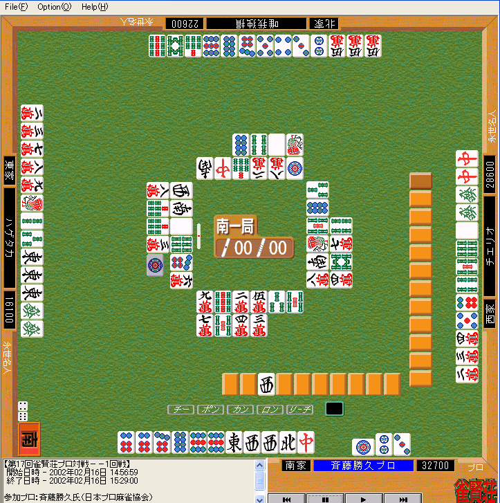 いちおうホンイツを狙っているとはいえ、ここからション牌の 次巡、下家のチェリオ氏に流れたのは当たり牌の どうでしょう。まさに他の三人を自在に操った一局です。もちろん動物的な勘にすぎ