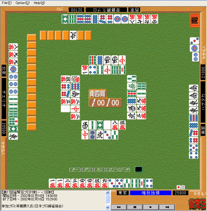 さすがは雀賢荘の2大エースです。結局、アガったのは唯我独損氏。ツモのみの500オールです(牌図2)。こうして勝負は次局の1本場に持ち越されました。 けれども結果から見るならば、このアガリで逆転しなかったことにより斉藤プロのト ップが決まったのでした。やはり幸運の女神は前髪だけ。唯我独損氏はこの局に賭ける カウンター作戦を取ったのですから、ここは一発で決めなければならなかったのです。 そのためには二つの道がありました。それは、(1)6巡目に切った 次局1本場には斉藤プロがピンフドラ1をアガって無事終了。このときのコメントはおとぼけでした。 斉藤「普通に打ってただけですが展開に助けられましたねー。まあ、こんなもんじゃないですか?」 |