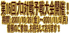 | 第16回プロ対戦予選大会を大会サロンにて、10月26日(金)13:00〜11月5日(月)10:00の間、開催します。 | ||||